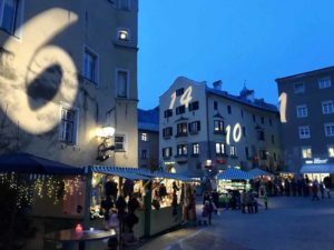 Nach dem Ausflug in die Münze sind wir noch zum Weihnachtsmarkt – für mich einer der schönsten Adventmärkte in Tirol! So haben wir auch dieses schöne Bild machen können. Die mittelalterlichen Hauswände rund um das Rathaus in Hall in Tirol werden mit den Zahlen von 1 bis 24 angeleuchtet. Romantisch erhellen sie den Nachthimmel unter dem Karwendelgebirge. Wenn du mal im Advent in Tirol bist, lohnt sich ein Besuch auf diesem besonders heimeligen Christkindlmarkt.