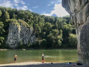 Der Donaudurchbruch ist einer der größten Anziehungspunkte der Gegend. Du kannst mit dem Schiff durch den Donaudurchbruch fahren oder auch mit dem Fahrrad entlang der Donau in die Richtung und dann über die Felsen wandern. Beides ist spannend mit Kindern, ich habe es schon probiert. Hinter dem Donaudurchbruch wartet das Kloster Weltenburg. Dort ist es mit Kindern an sich nicht so spannend. Es gibt aber eine große Halbinsel aus Kies, auf der das Kloster Weltenburg steht. Je nach Wasserstand bildet sich ein größerer oder kleinerer Kiesstrand, wo du gut ein Picknick machen kannst und die Kinder die flachen Steine über die Donau springen lassen können. Sehr gut ist auch die Einkehr im Biergarten von Weltenburg! Ich mag das dunkle süffige Bier besonders gerne…